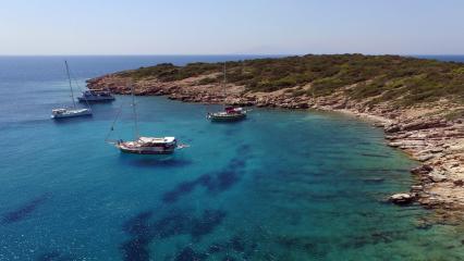 Orak Island has become famous for its marine life, and of course the crystal clear water. The Island is just 10 miles from Bodrum, heading east. Yachts and blue cruises regular pass by and often stop, even if they have an alternative destination. There are a number of lovely coves that sit below the many olive groves. Orak is not inhabited but it certainly enjoys a temporary population on yachts anchoring overnight.