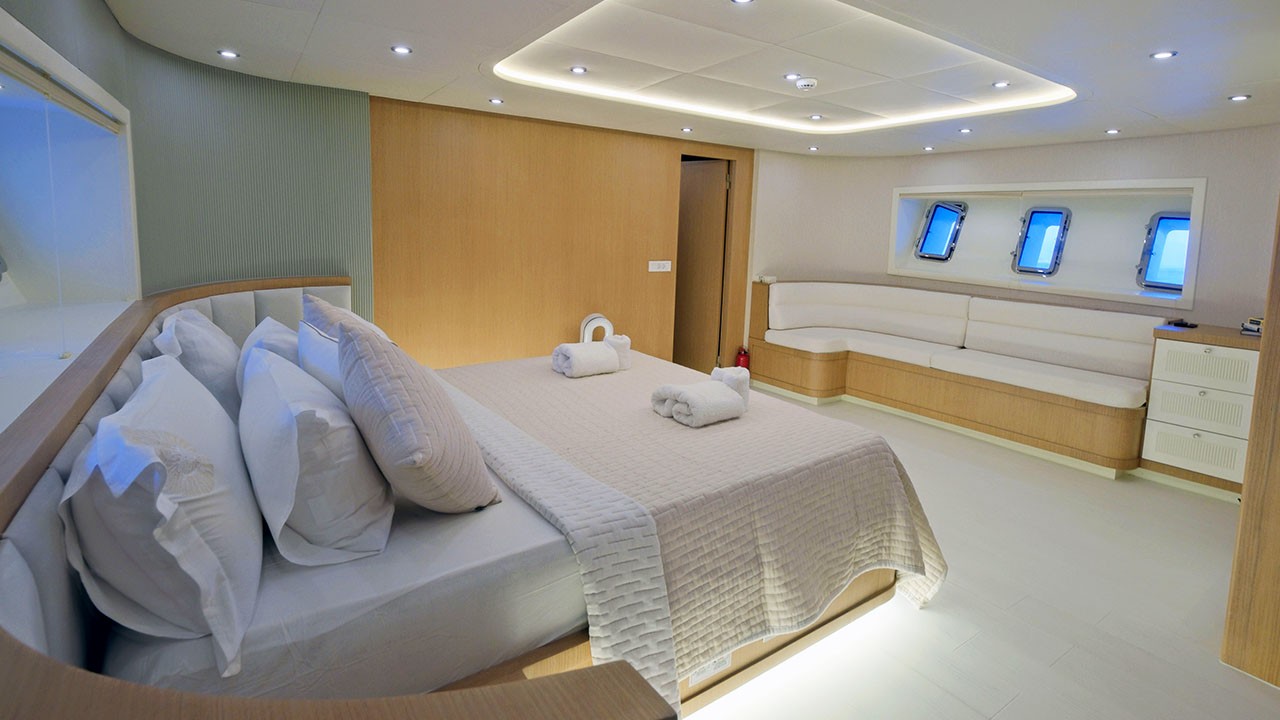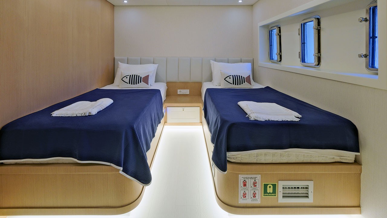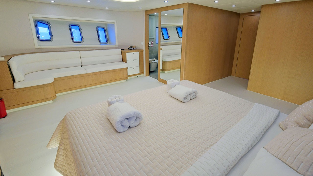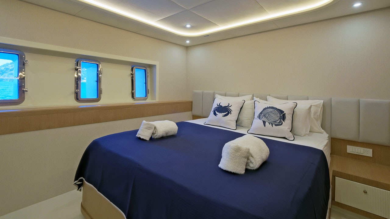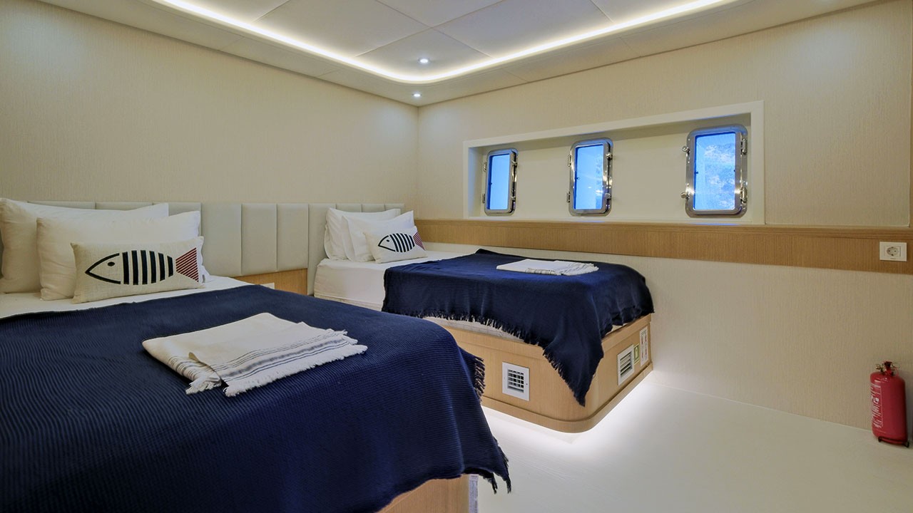 The super luxury yacht is 43 meters long with 2 Master, 2 Double, 2 Twin Cabins, a total accommodation capacity of 12 guests. Each cabin is well-equipped with private shower and wc facilities and air conditioning to ensure a comfortable stay on hot summer days. All cabins have TV, DVD and music system.