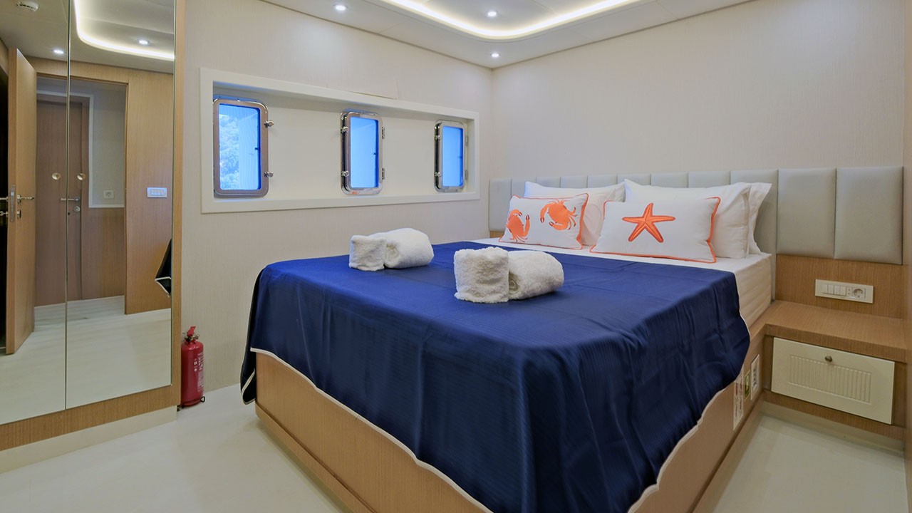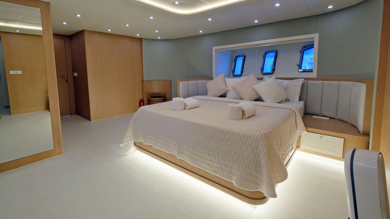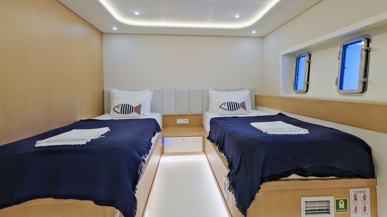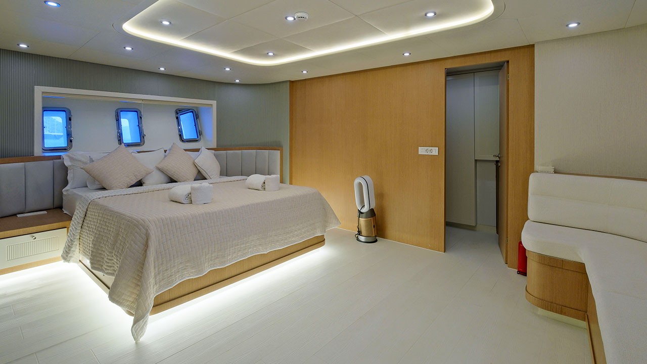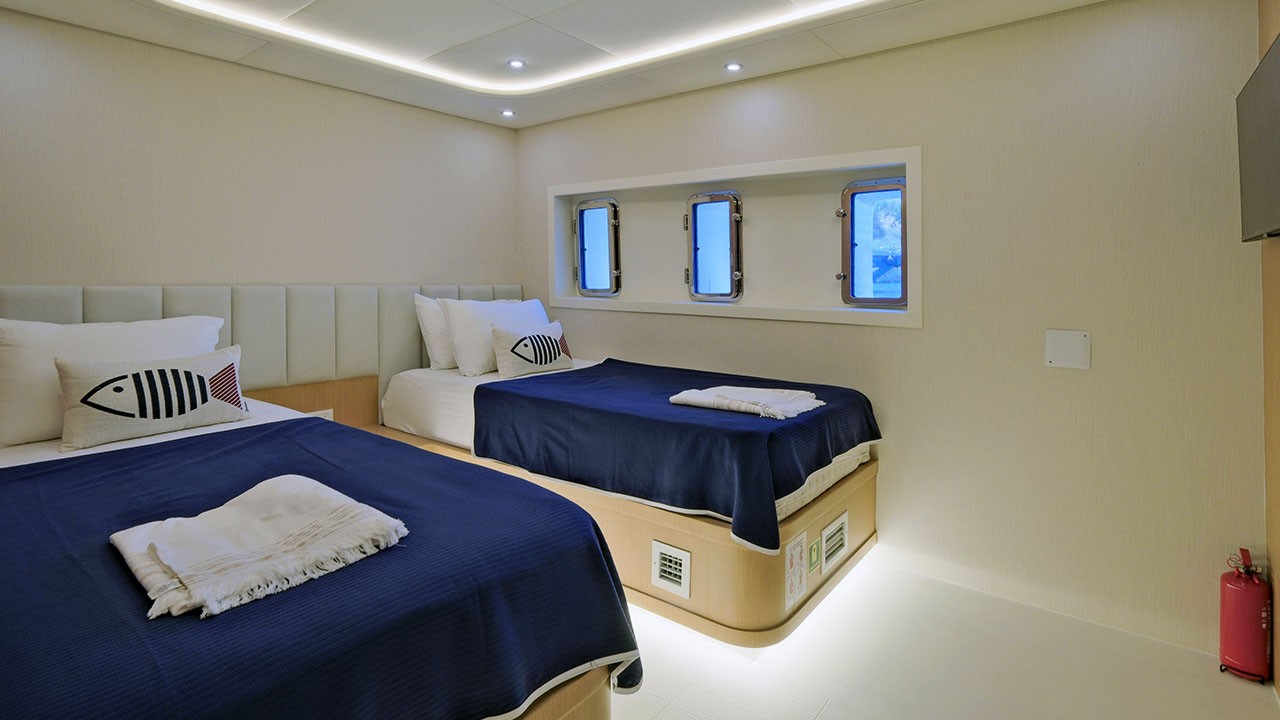 The super luxury yacht is 43 meters long with 2 Master, 2 Double, 2 Twin Cabins, a total accommodation capacity of 12 guests. Each cabin is well-equipped with private shower and wc facilities and air conditioning to ensure a comfortable stay on hot summer days. All cabins have TV, DVD and music system.