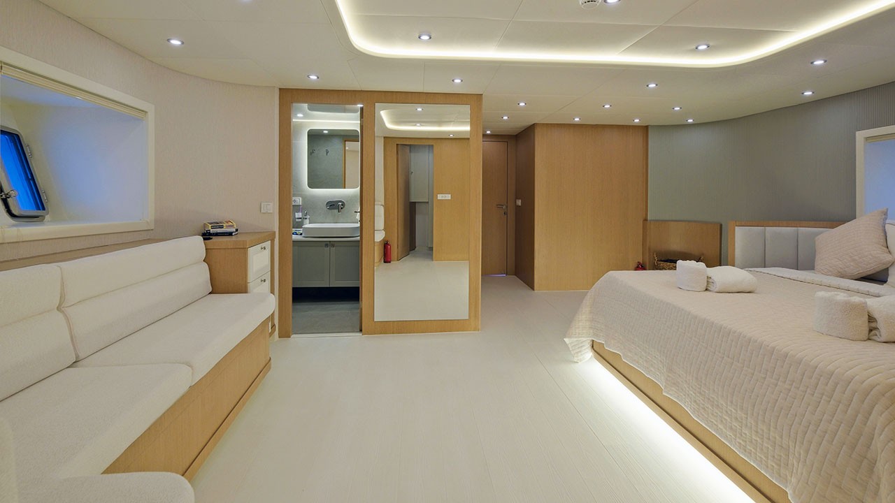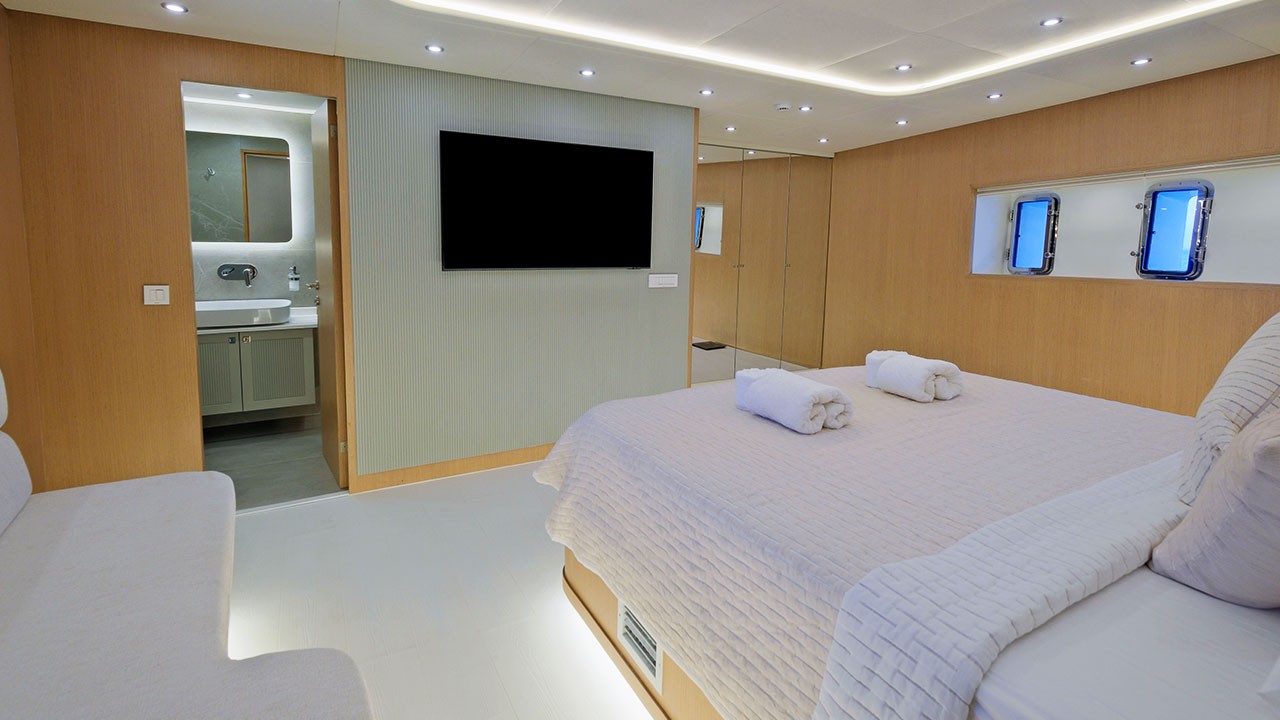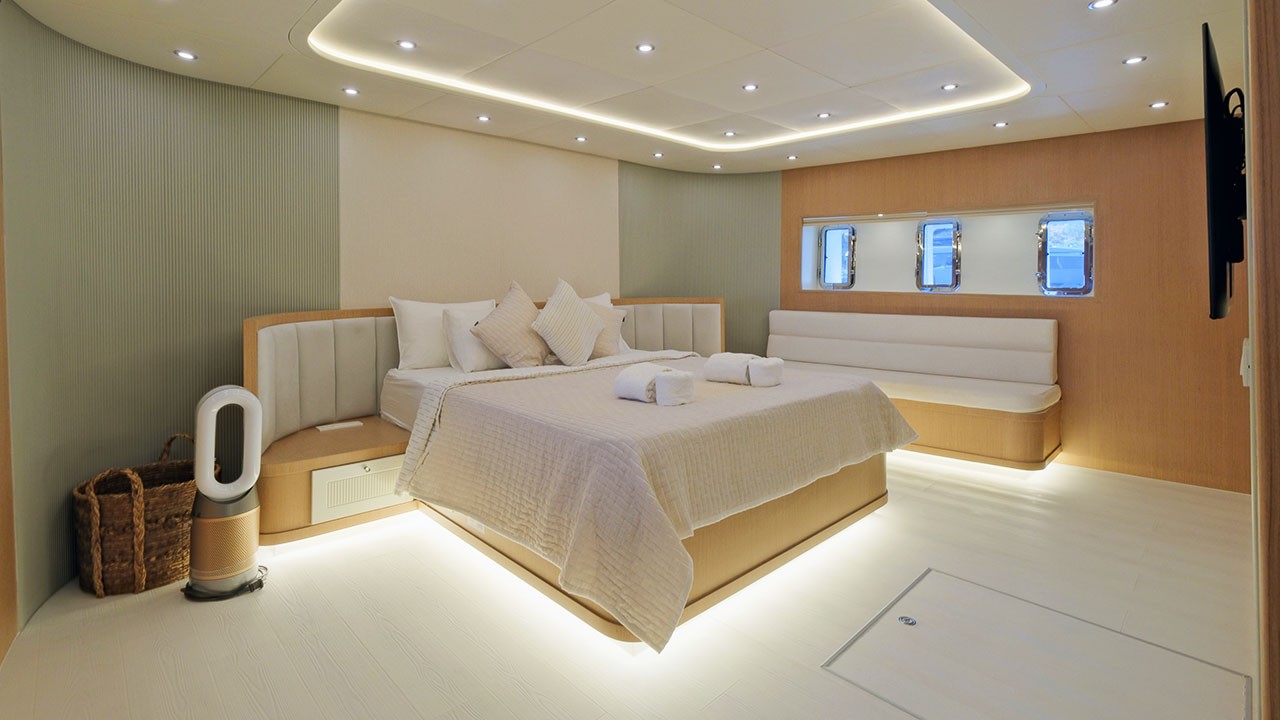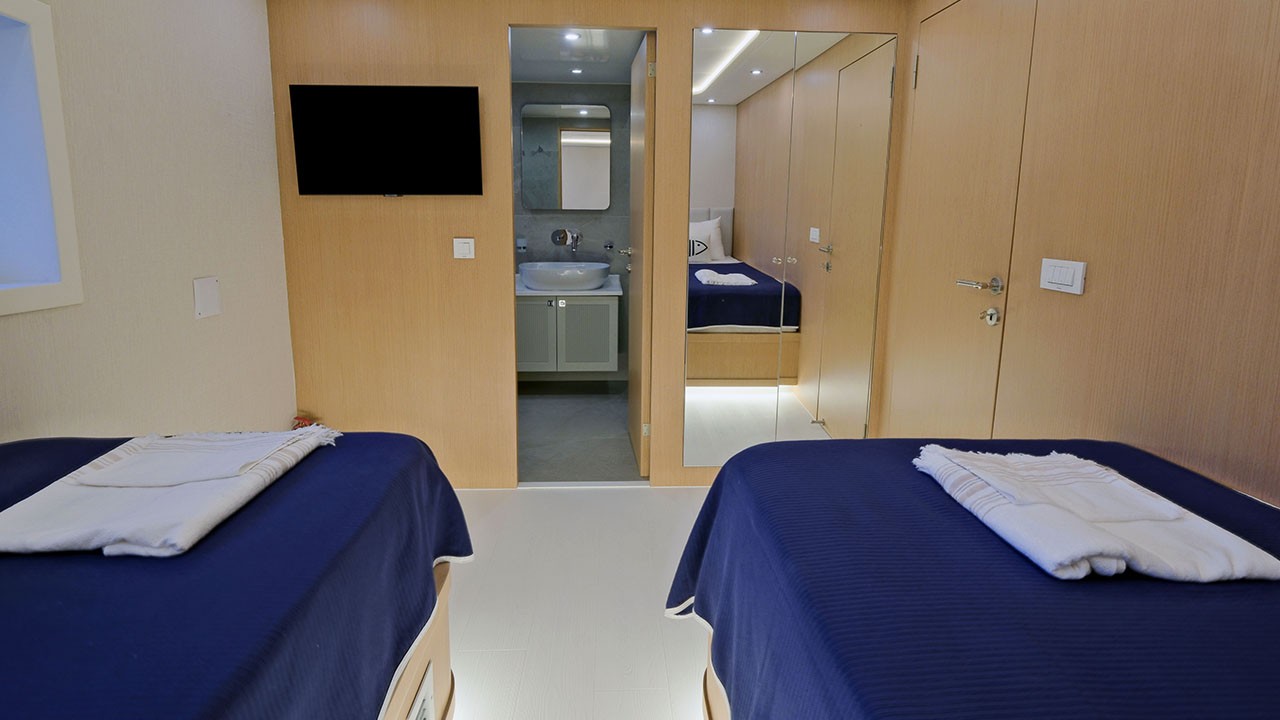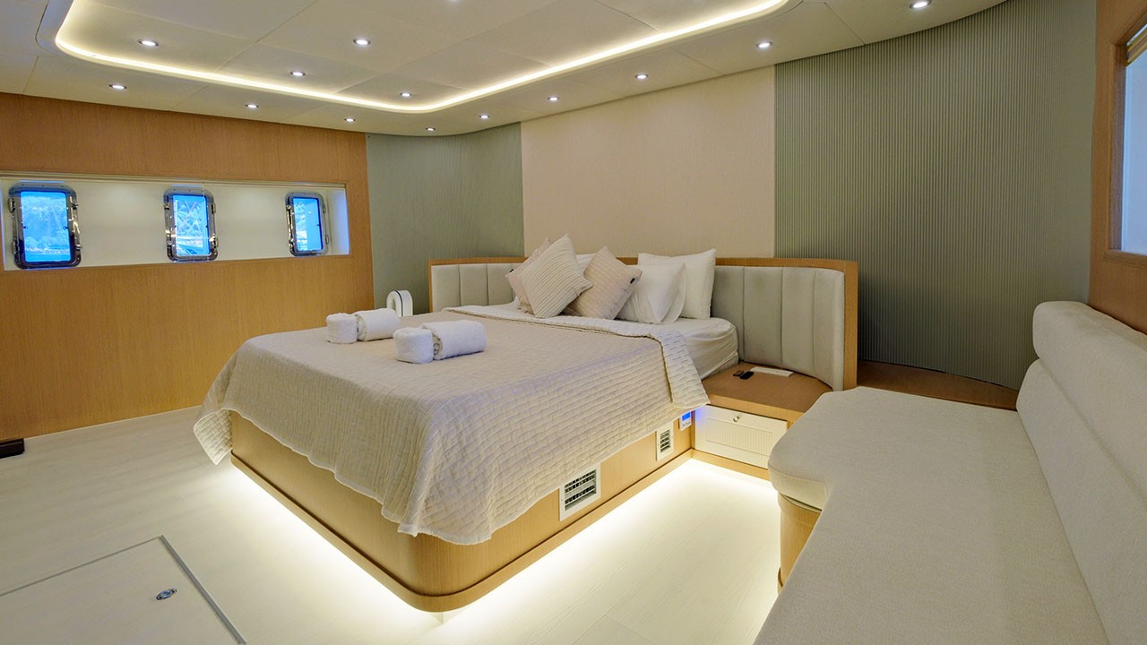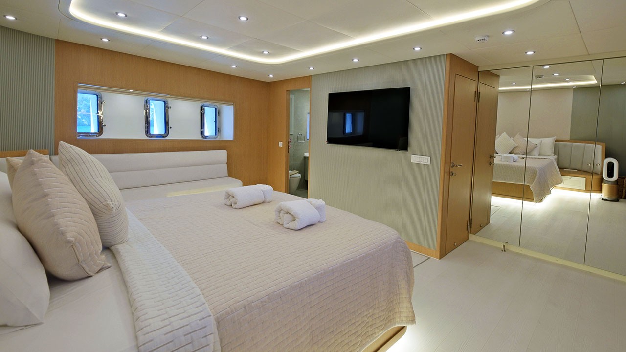The super luxury yacht is 43 meters long with 2 Master, 2 Double, 2 Twin Cabins, a total accommodation capacity of 12 guests. Each cabin is well-equipped with private shower and wc facilities and air conditioning to ensure a comfortable stay on hot summer days. All cabins have TV, DVD and music system.