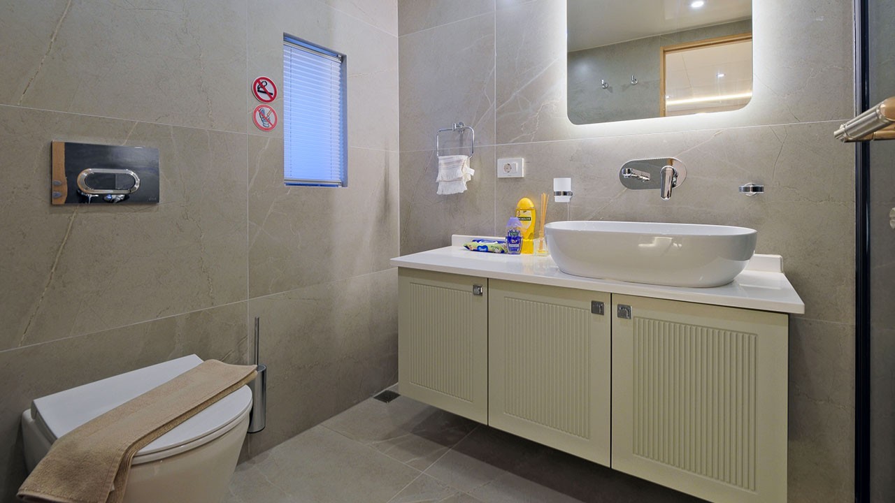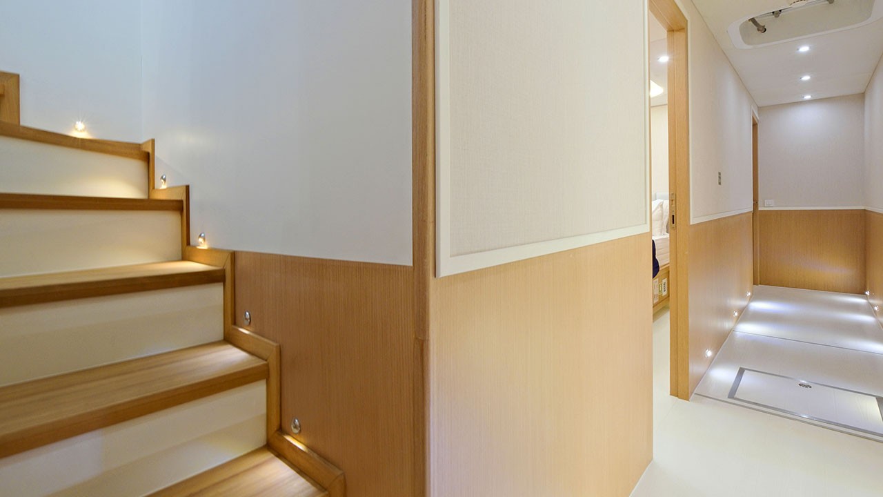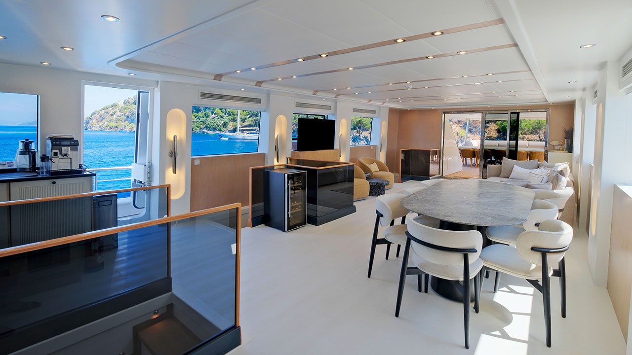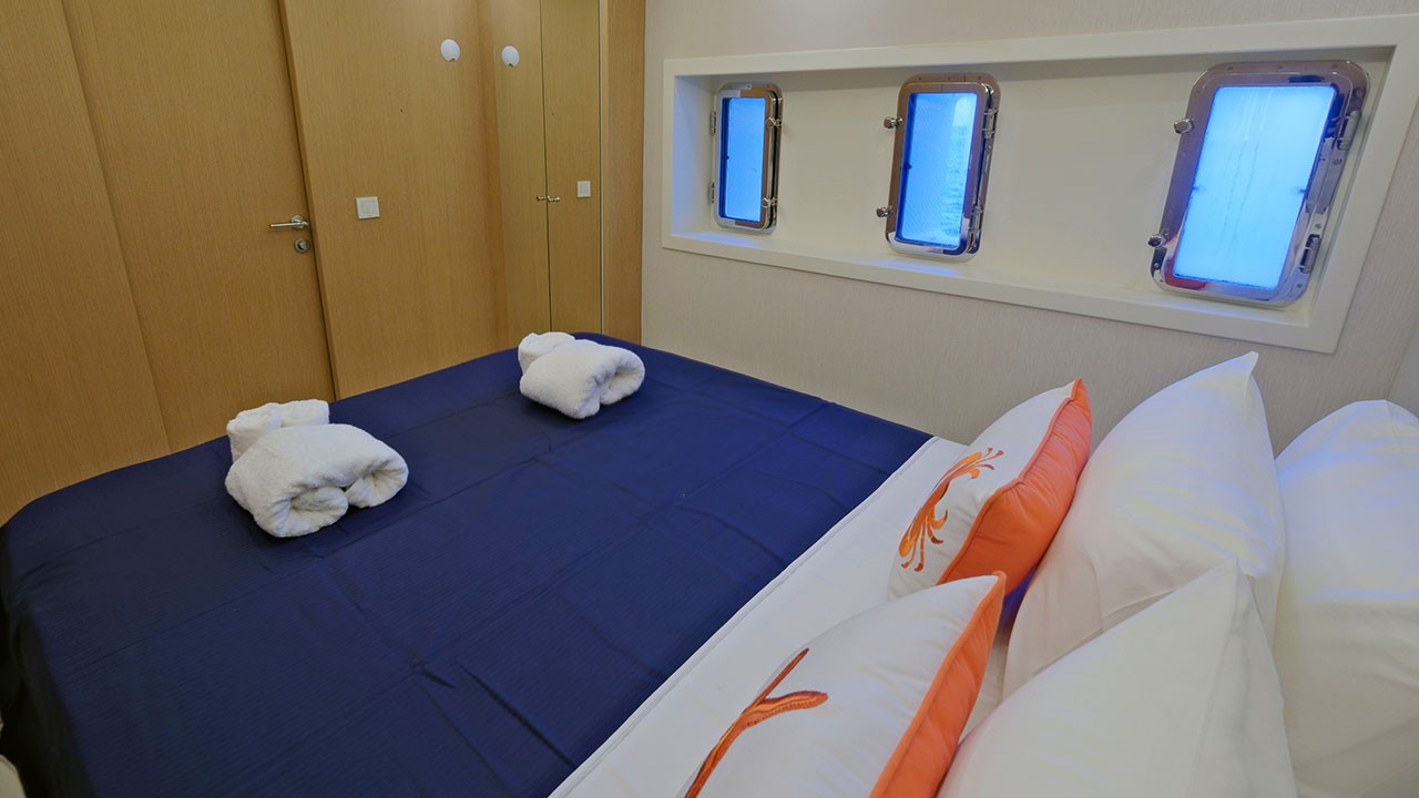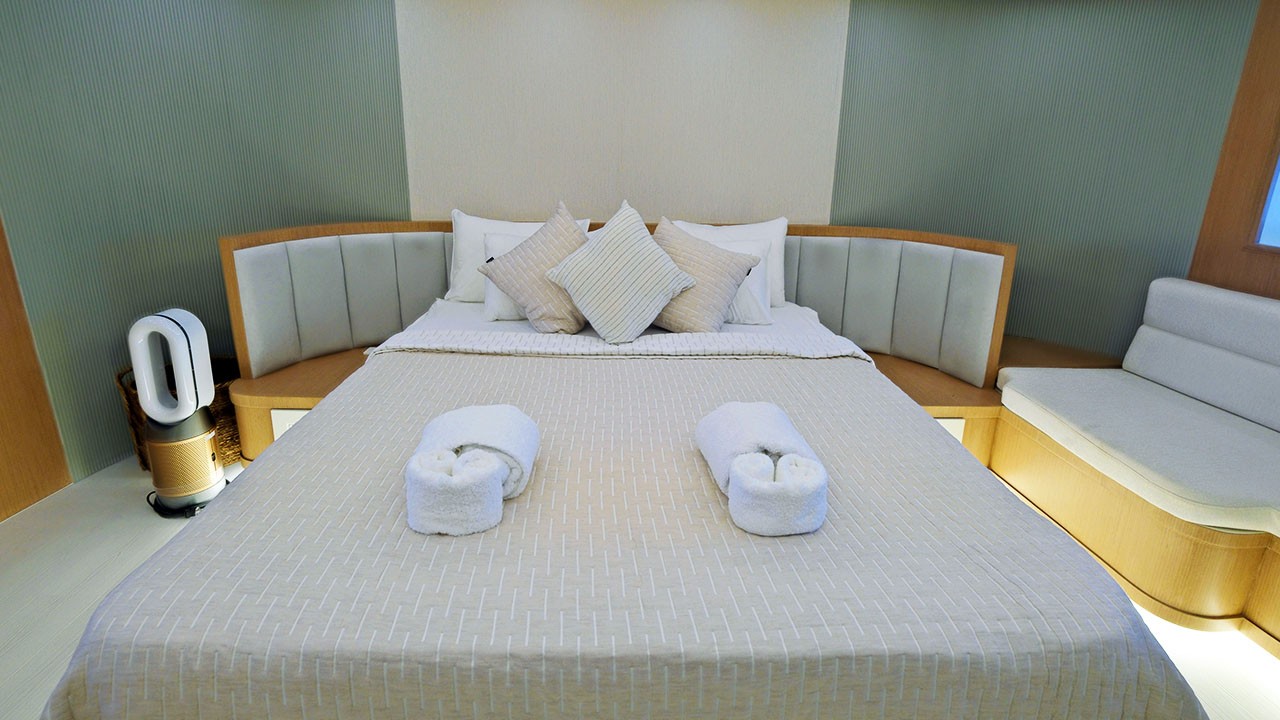 The super luxury yacht is 43 meters long with 2 Master, 2 Double, 2 Twin Cabins, a total accommodation capacity of 12 guests. Each cabin is well-equipped with private shower and wc facilities and air conditioning to ensure a comfortable stay on hot summer days. All cabins have TV, DVD and music system.