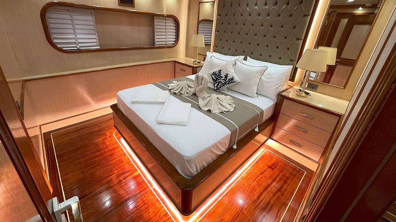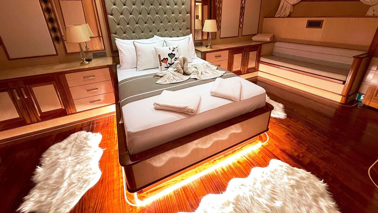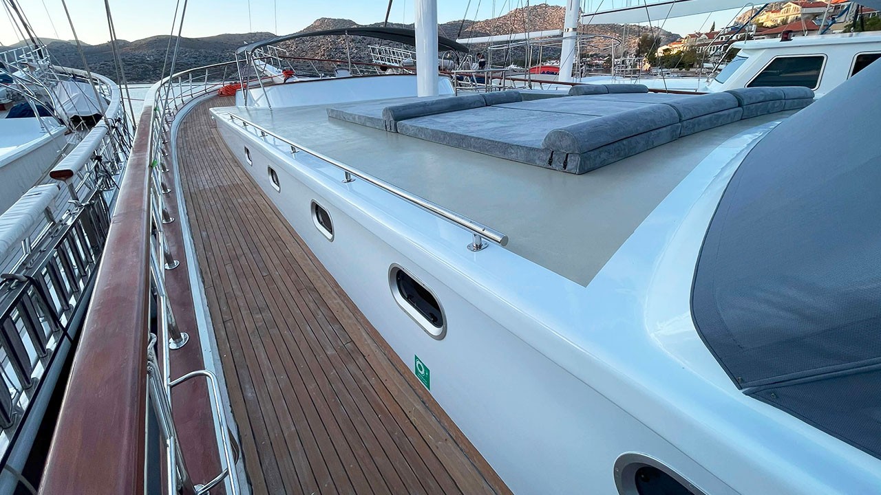 Kaan Ayaz 1 Gulet not only offers high-quality layout and furnishings but also offers luxury service with a highly professional 6 crew including an experienced. That crew consists of the captain, chef, deckhand as well as service personnel. They have accommodation separate from the passengers. The crew is committed to all your needs such as organizing daily activities in the boat, cleaning, general service, meals and drinks, and security. Safety and comfort of our guests is an absolute priority and the crew has been trained to ensure that.