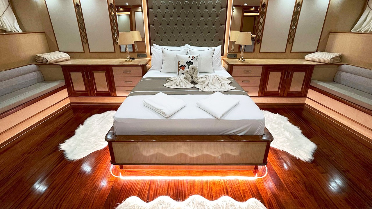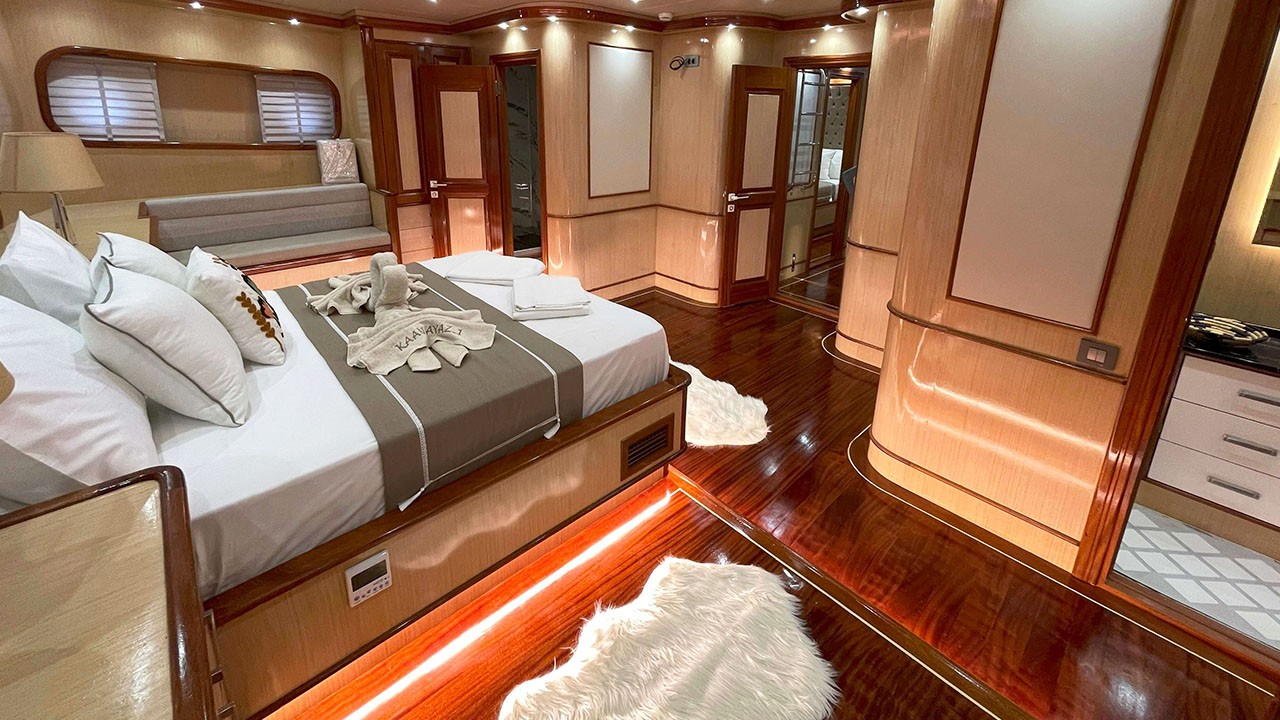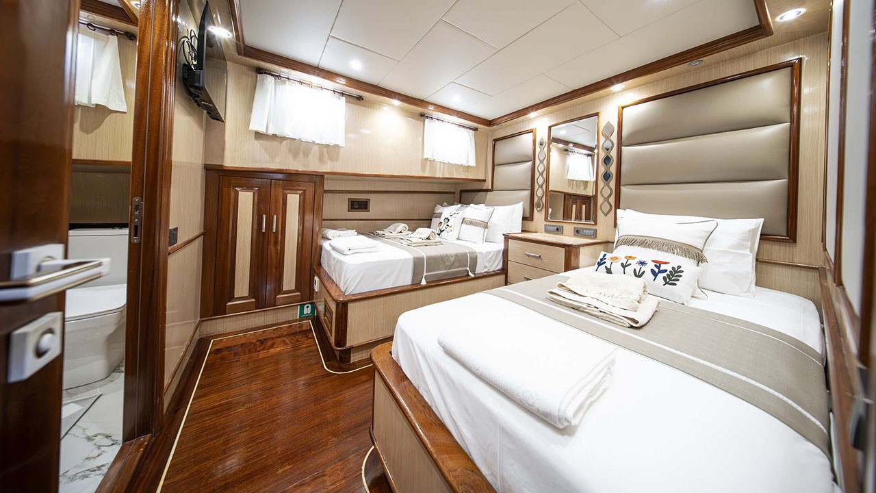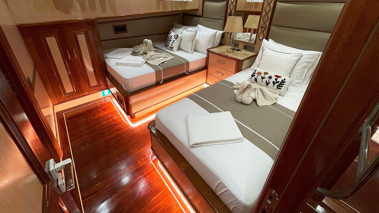 Kaan Ayaz 1 is a high-quality Gulet, 36 meters in length, built in 2025. There are modern and spacious cabins, specially designed with hall and deck. She accommodates 12 guests in 2 Master, 2 Double, 2 Triple Cabins, Each has a private shower and toilet. All yachts, including cabins, are air-conditioned.