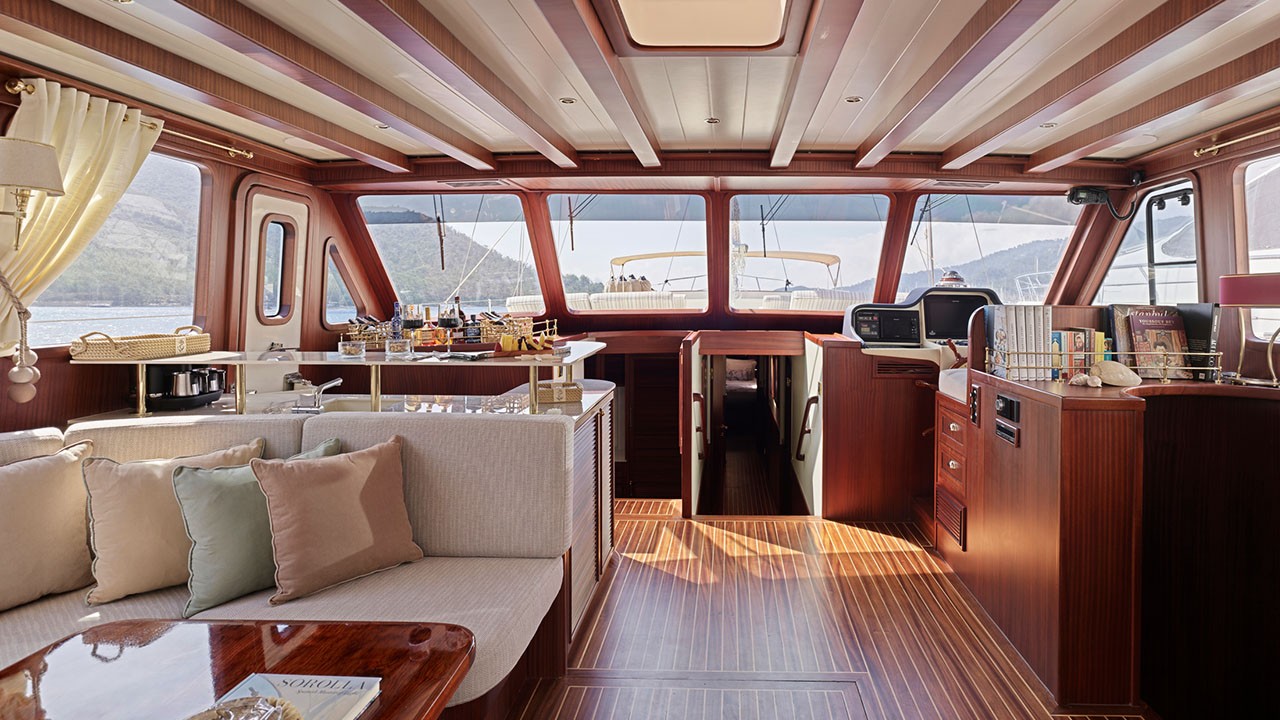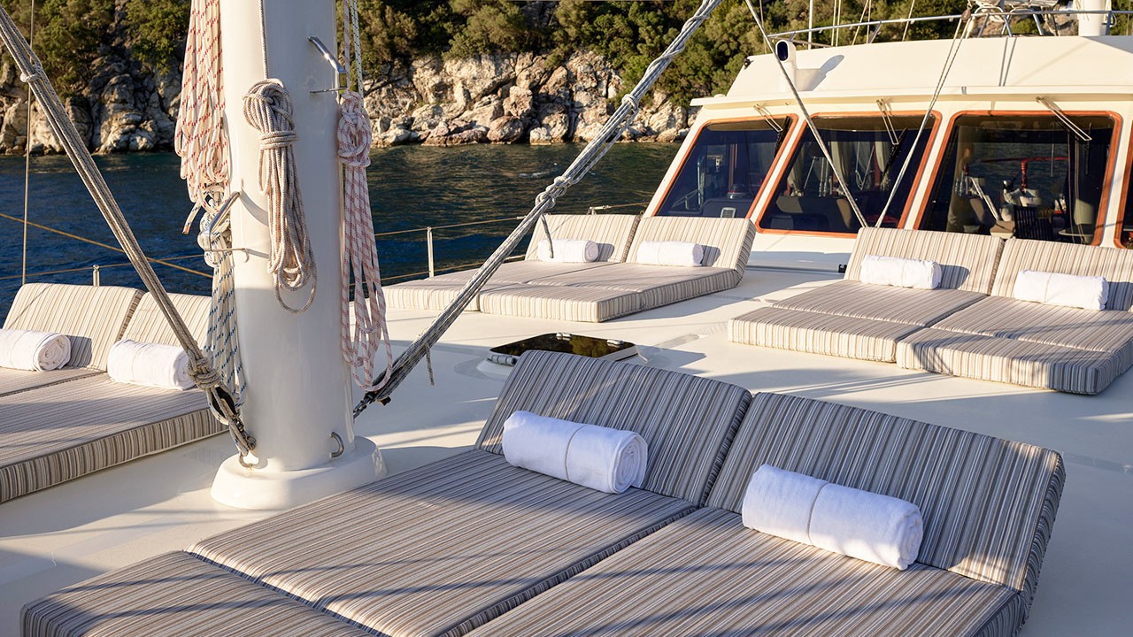 Kaftan is a high-quality Gulet, 28.50 meters in length, and completely renovated in 2022. There are modern and spacious cabins, specially designed with hall and deck. She accommodates 8 guests in 1 Master, 1 Double, 1 Twin, 1 Triple Cabins, Each has a private shower and toilet. All yachts, including cabins, are air-conditioned.