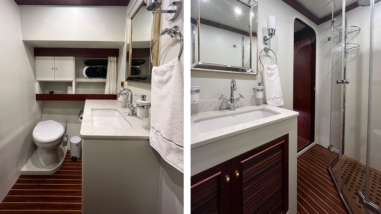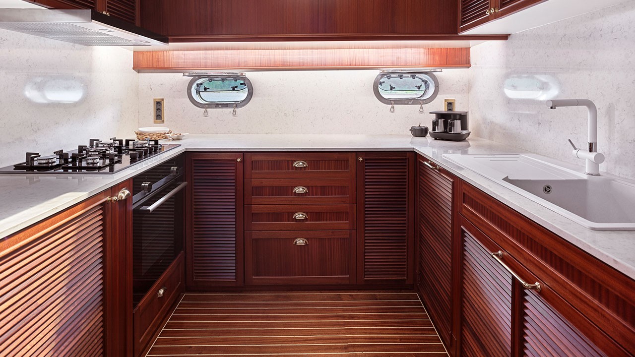 There is a fully equipped kitchen, an indoor and outdoor dining area, and an air-conditioned lounge. There is a TV, DVD and music system in the saloon. There is also a large sun deck with enough sunbathing mats for all.