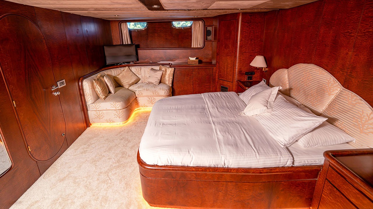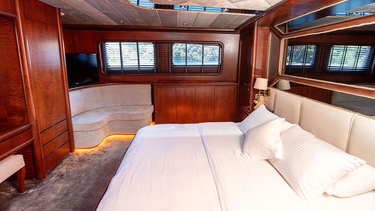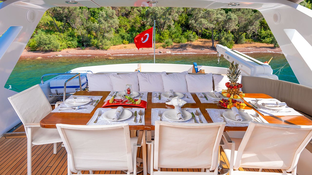 | Indoor Dining, Internet Connection, VHF Radio, Fully Equipped Galley, Satellite, Watermaker, TV & DVD Player in saloon, Ice Maker, Tv & Dvd In All Cabins, Music System in salon, Deck shower, Full Navigation Equipments, Card Games, Backgammon, Sun Mattresses, Full Safety Equipments, Life Jackets, Ipod Connection, Liferaft, Deck with dining area, Marine Type Toilet, Fire Extinguishers, Air conditioner, Flybridge | |||||