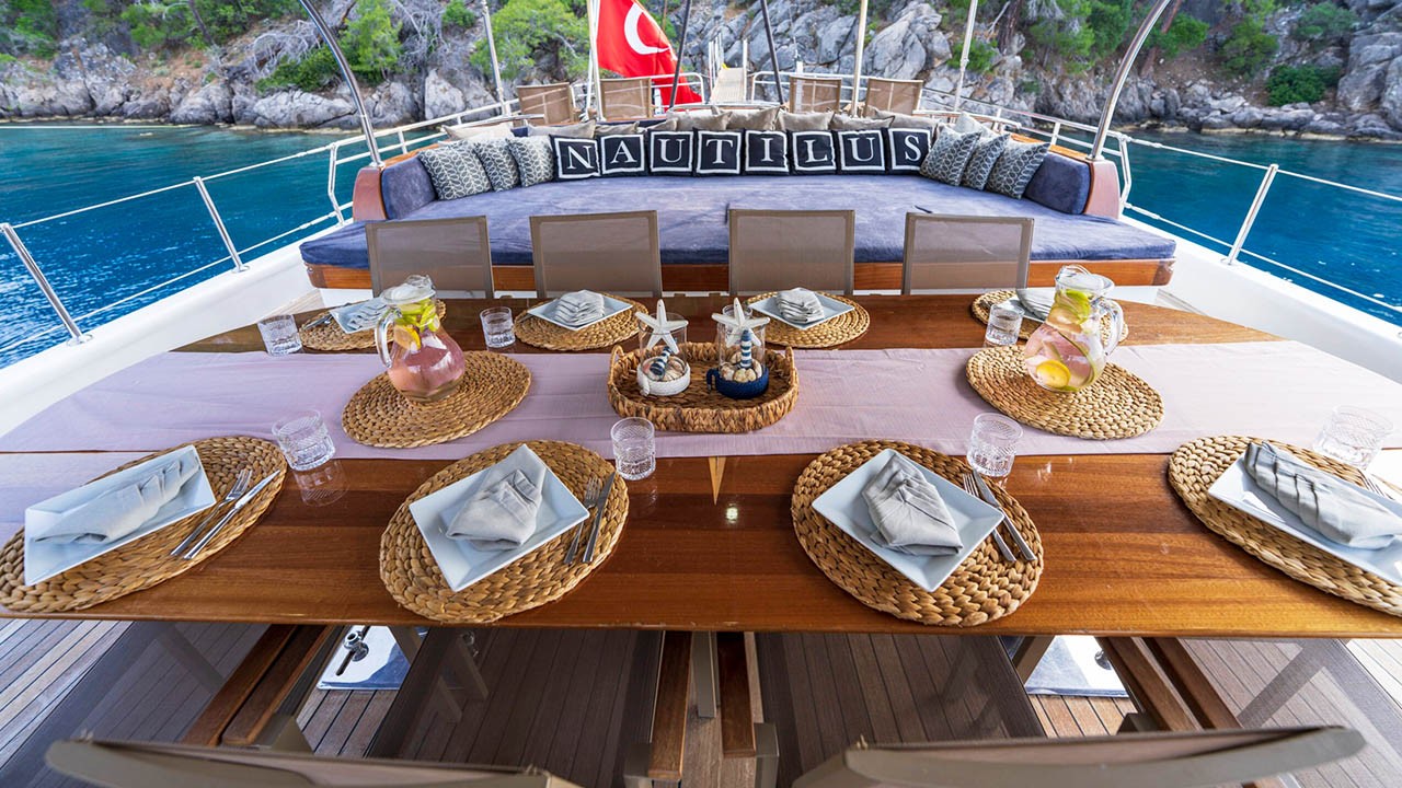 Nautilus (Turkey) Gulet not only offers high-quality layout and furnishings but also offers luxury service with a highly professional 5 crew including an experienced. That crew consists of the captain, chef, deckhand as well as service personnel. They have accommodation separate from the passengers. The crew is committed to all your needs such as organizing daily activities in the boat, cleaning, general service, meals and drinks, and security. Safety and comfort of our guests is an absolute priority and the crew has been trained to ensure that.